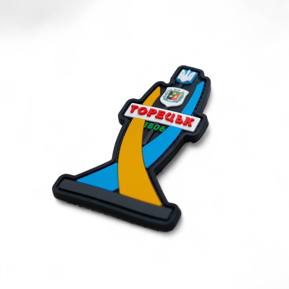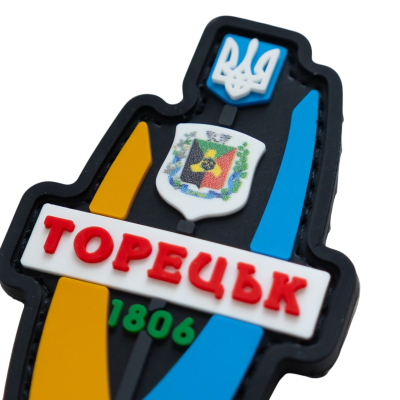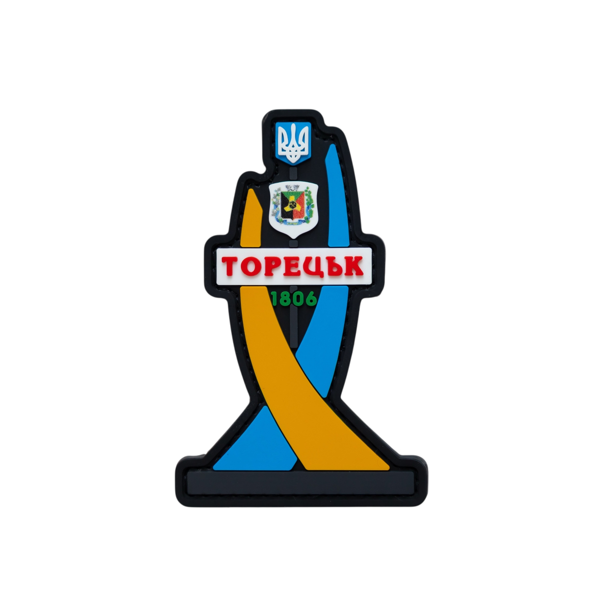 This patriotic patch is dedicated to the Ukrainian city of Toretsk. It features the name of the city, Toretsk, in large letters. The emblem is a concise yet expressive sign of respect and support for Toretsk.