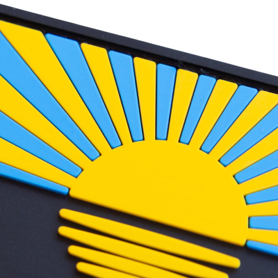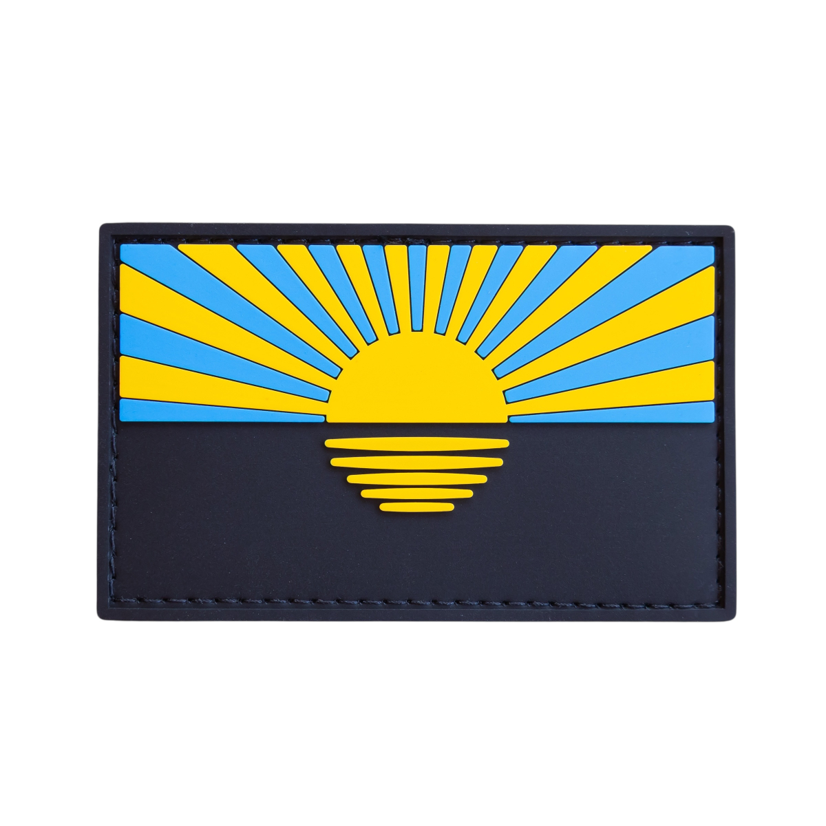 The image shows a patch called “Sun.” This bright and symbolic accessory is made in patriotic colors, combining yellow and blue shades that reflect the Ukrainian flag. The patch depicts a stylized sun rising or setting over the horizon, symbolizing hope, a new beginning, or indomitable spirit. It will be a wonderful addition for those who want to express their love for Ukraine and their faith in a bright future.