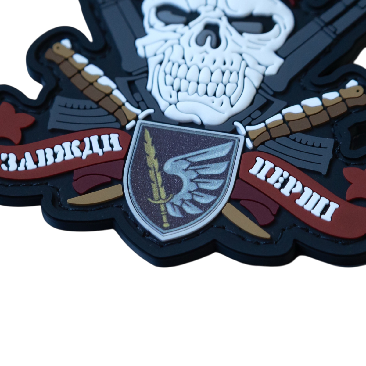 The central skull in a blood-red beret embodies contempt for danger and is a symbol of the fearless military elite. The crossed assault rifles are a guarantee of the firepower that accompanies every step of the advance guard. And at the heart of the composition, on the shield, pulsates the spirit of the unit, confirming its glorious history.