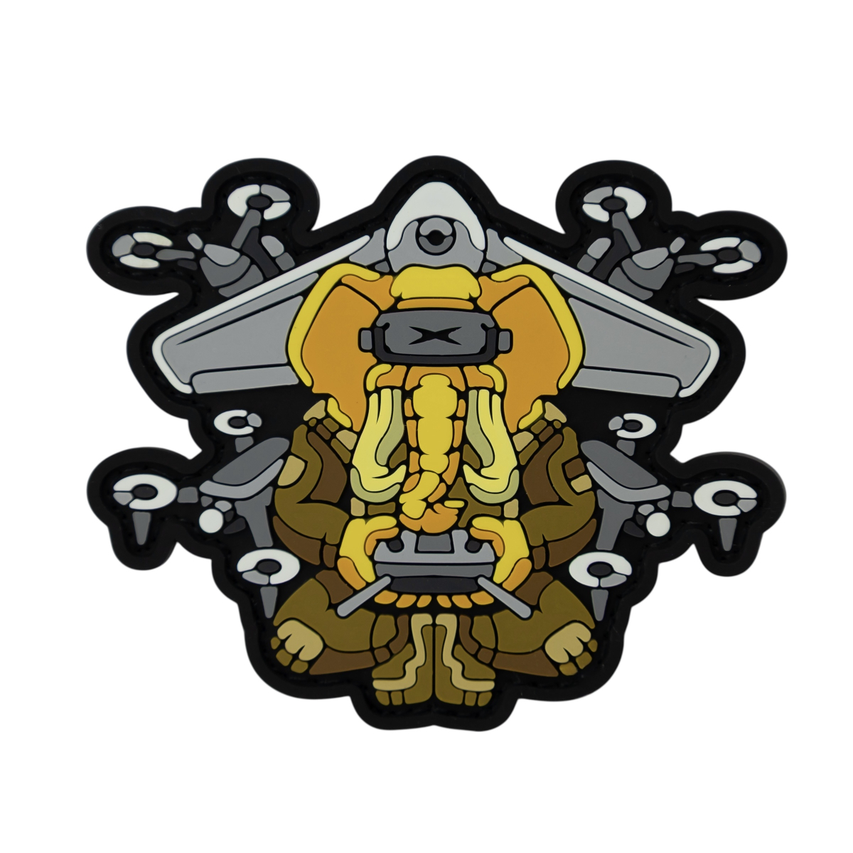 This PVC patch is a modern embodiment of a powerful deity, where the wisdom of Ganesha merges with technological superiority. Dressed in combat gear and equipped with virtual reality goggles, he sits as if in meditation, controlling a whole swarm of drones and a fighter jet soaring above his head. The patch symbolizes the intelligent force that elevates the operator above the battlefield, transforming him into the undisputed master of the skies.