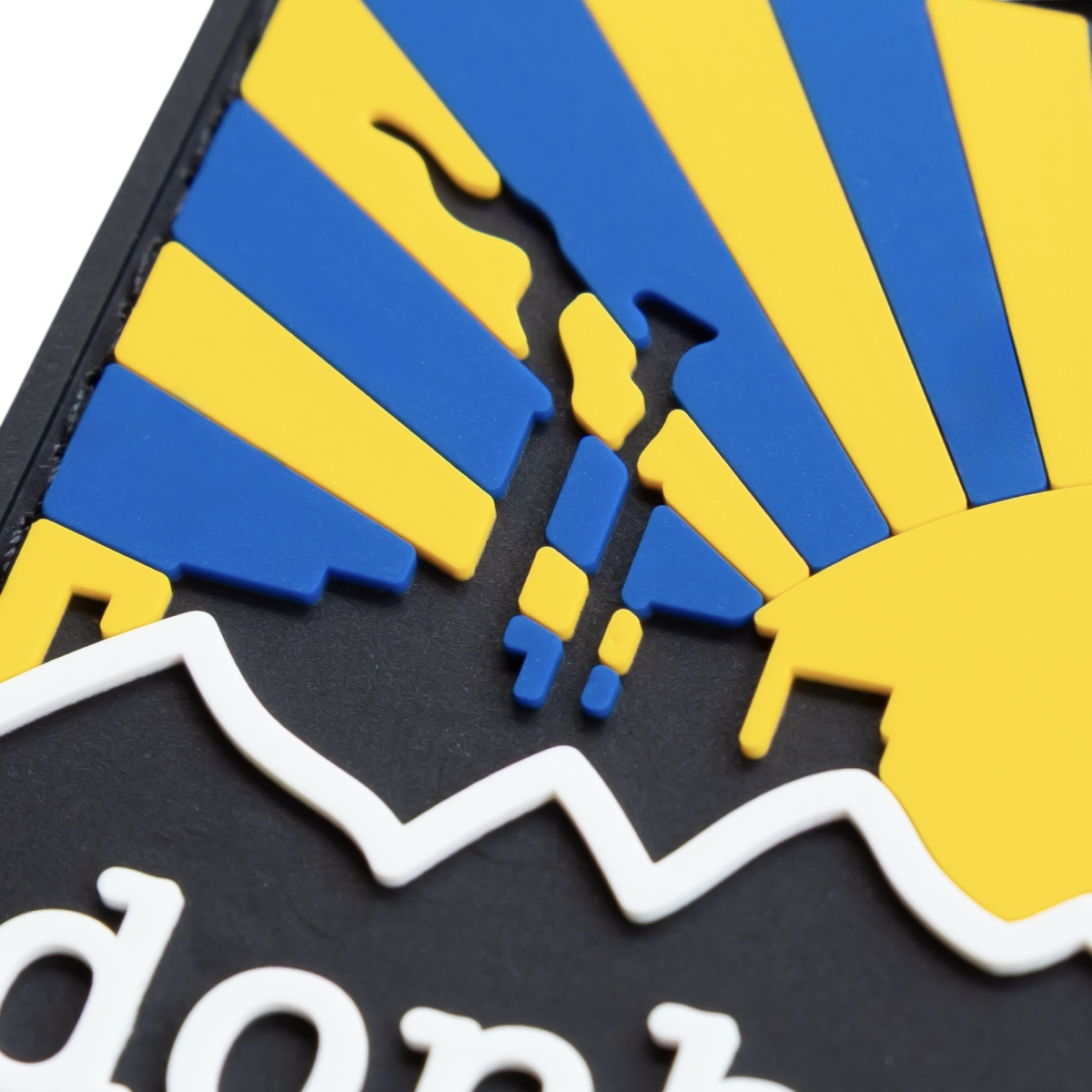 The Donbanistan patch is an ironic symbol of the indomitable Donbas, greeting the dawn against a backdrop of industrial chimneys, slag heaps, and the debris of war. The yellow and blue rays remind us that even through smoke and ruins, light breaks through. The silhouettes of the Bakhmut Arch and a helicopter add recognizable details to the patch. For those who remember, fight, and believe.
