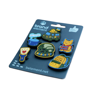 Набір джибітсів “Волонтер” від українського бренду Brand Element присвячений незламним людям, які щодня наближають перемогу своєю допомогою. У комплекті шість якісно виконаних елементів: волонтерський шолом, ліхтарик, авто для евакуації та доставки гуманітарної допомоги, рюкзак, каструлька та котик — символ тепла і турботи. Кожен джибітс втілює відданість, людяність і щире серце українських волонтерів. Виготовлений із міцного ПВХ, набір стане яскравою деталлю ваших кроксів чи рюкзака та нагадуватиме про силу єдності.