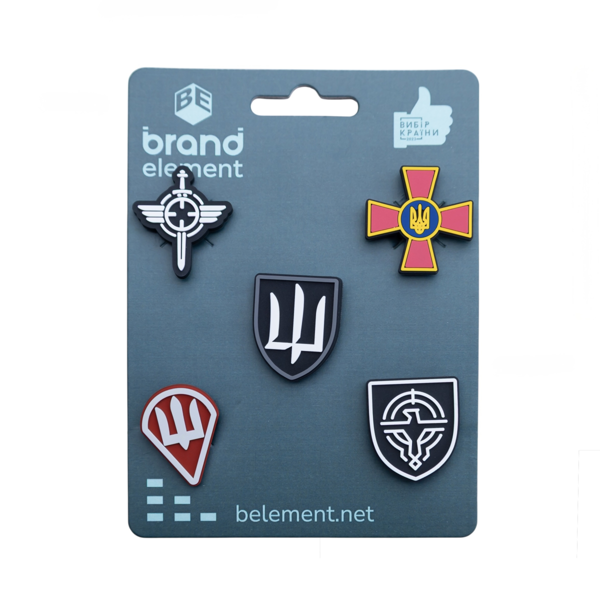 Набір джибітсів “Емблеми” від українського бренду Brand Element створений на честь ключових формувань оборонного щита України. До комплекту входять п’ять якісно виконаних елементів, що зображають емблеми: Збройних Сил України, Десантно-штурмових військ, Головного управління розвідки, Аеророзвідки та Сил безпілотних систем. Кожен джибітс — це символ сили, професіоналізму та гордості за наших захисників. Виготовлений із міцного ПВХ, набір стане патріотичним акцентом на ваших кроксах чи рюкзаку.