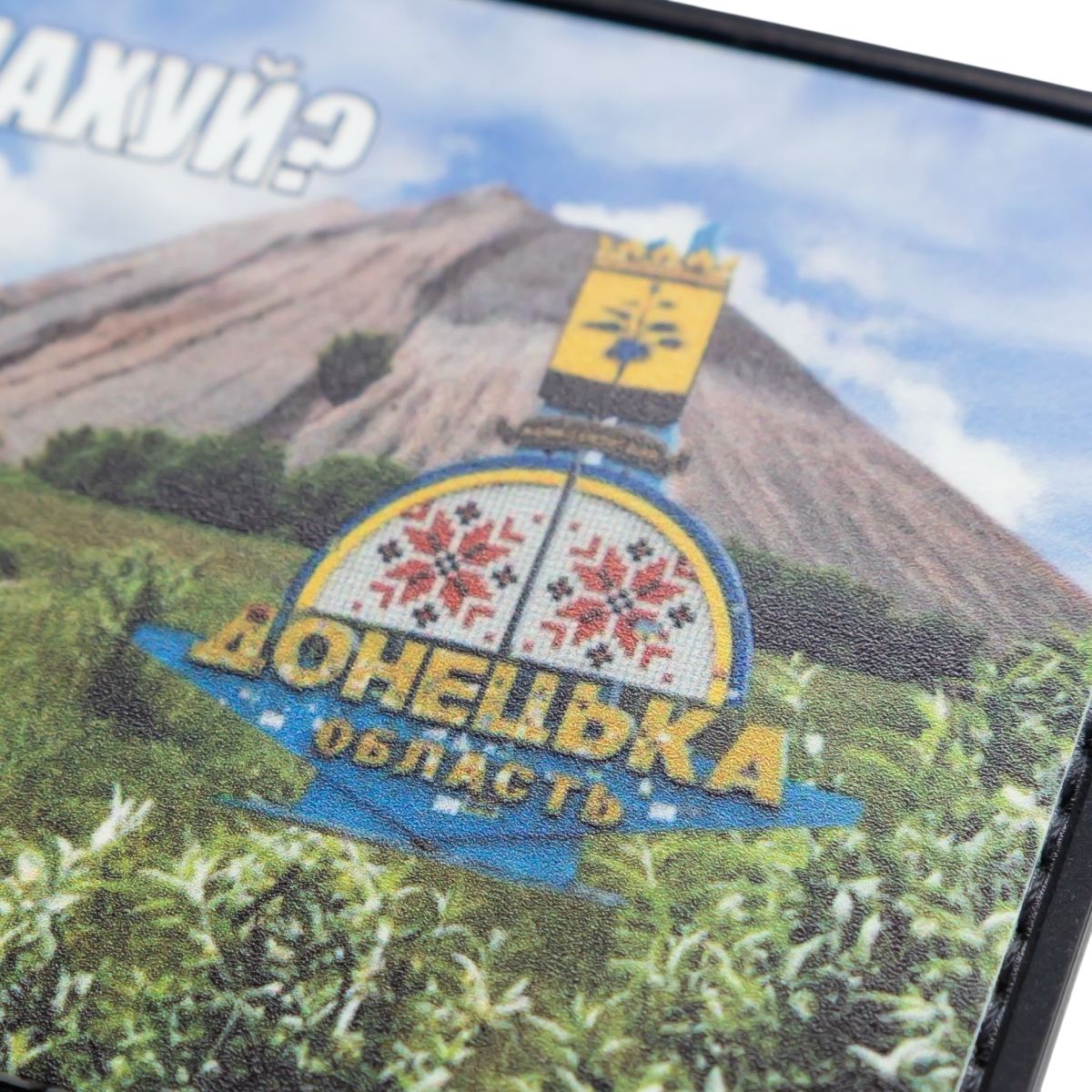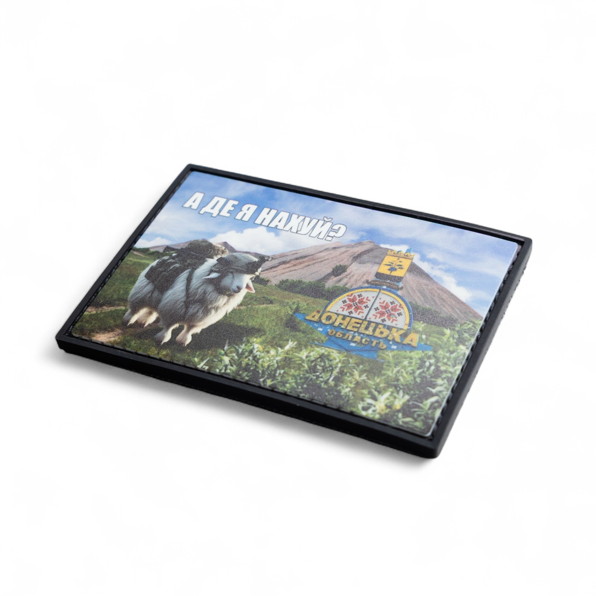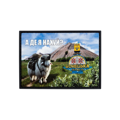 Патч "А де я" — це гумористичний та водночас глибокий аксесуар, який відтворює популярний інтернет-мем. На ньому зображено вівцю, обвішану спорядженням, на тлі типового ландшафту Донецької області з териконом та символічним знаком.
