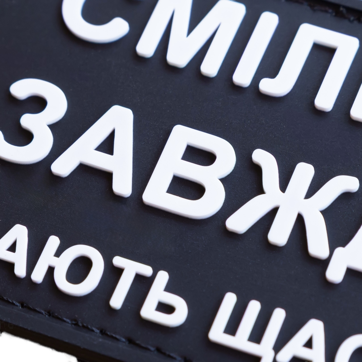 Цей патч - не просто аксесуар, а символ бунтарського духу та непокори. Чорний фон та контрастні білі цифри створюють вражаючий візуальний ефект, привертаючи увагу до провокаційного напису "Сміливі завжди мають щастя".