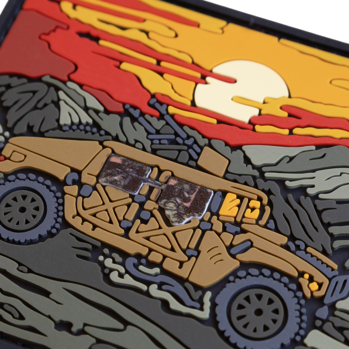 На зображенні представлений патч під назвою "Hummer". Він виконаний у мілітарі стилістиці та зображує військовий автомобіль Humvee, що пересувається гірською місцевістю на тлі яскравого заходу сонця. Деталізований малюнок передає міць і надійність транспортного засобу, а гірський пейзаж підкреслює складність умов експлуатації. Цей патч ідеально підходить для поціновувачів військової техніки та символізує витривалість та готовність до будь-яких викликів.