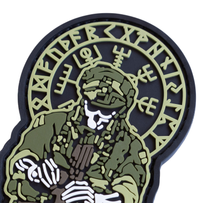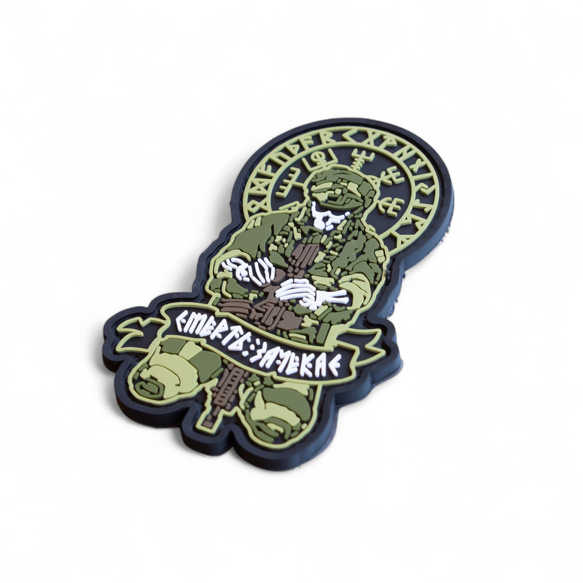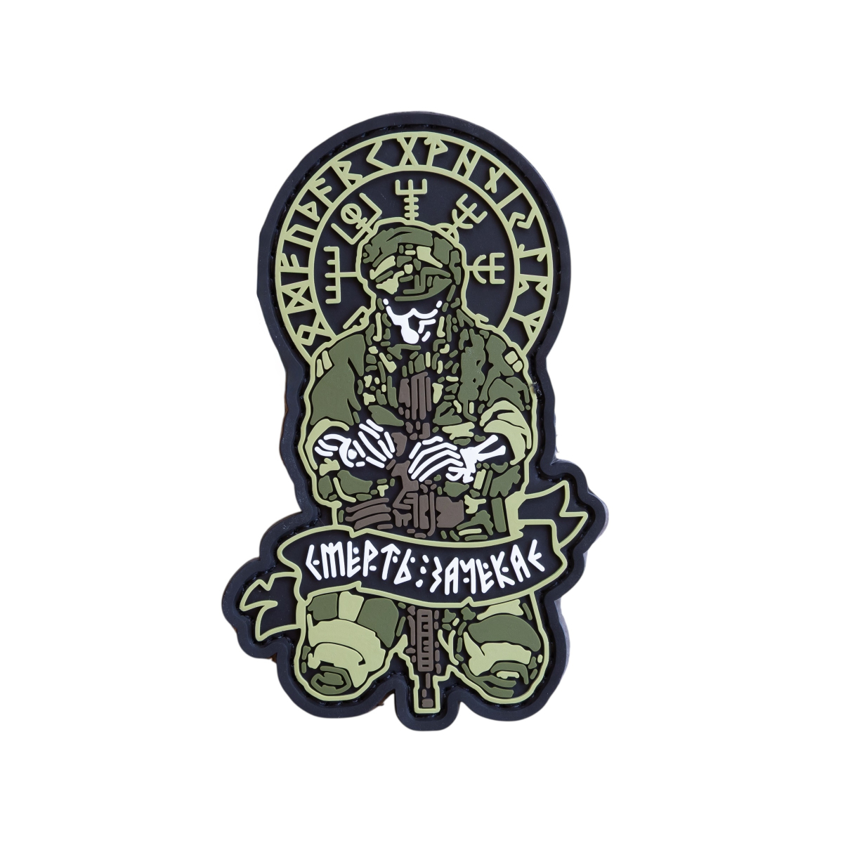 Патч зображує скелет у військовій формі з гвинтівкою, що стоїть на колінах, символізуючи незламність та боротьбу до останнього подиху. Навколо фігури розташовані рунічні символи, які додають містичного та стародавнього значення, підкреслюючи силу духу. Внизу розміщена стрічка з назвою "Смерть зачекає", що відображає ідею безстрашності та рішучості. Цей патч є потужним символом витривалості та відданості своїй справі.