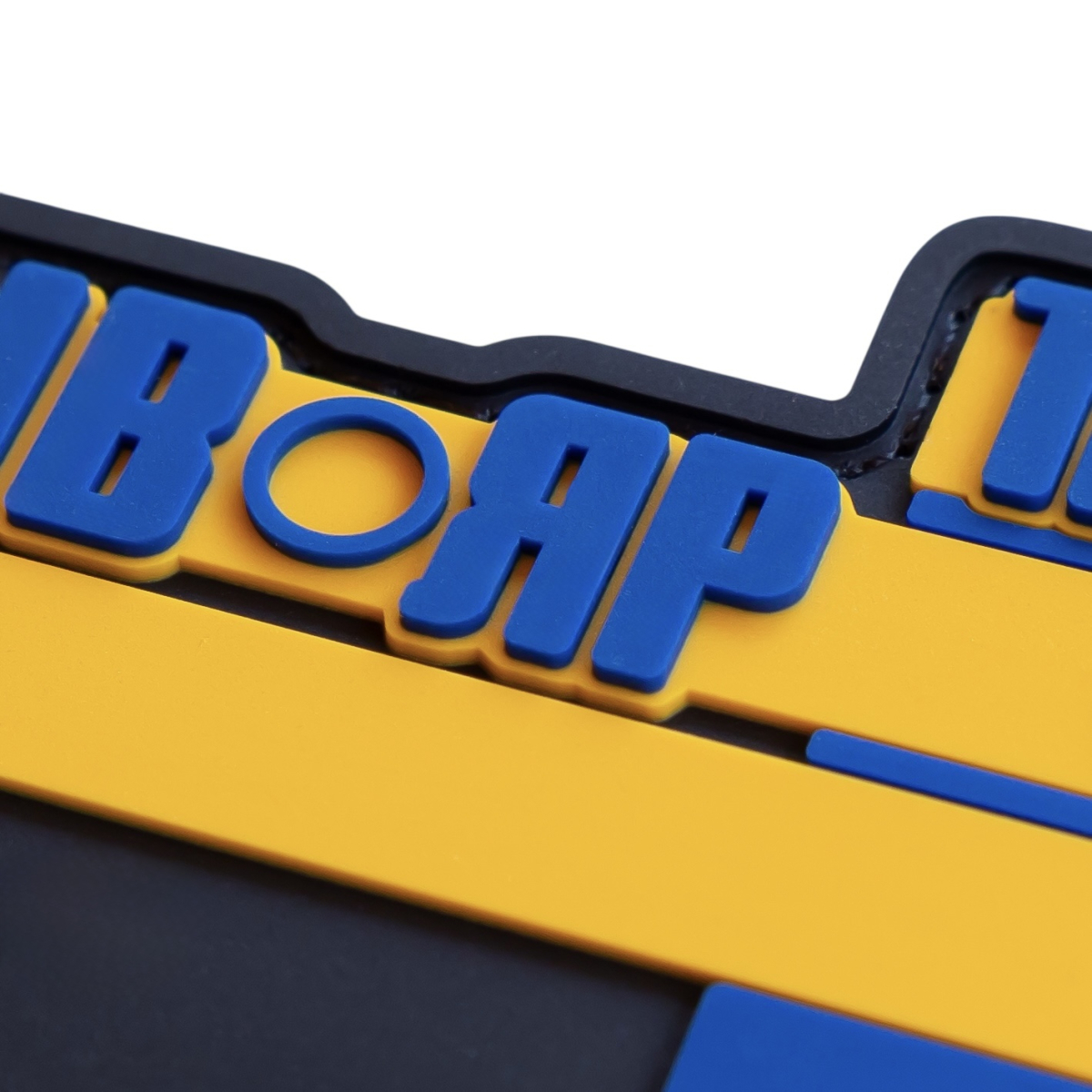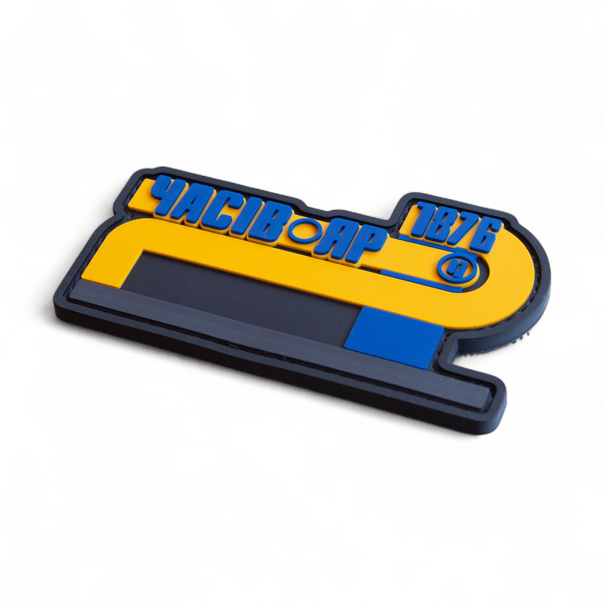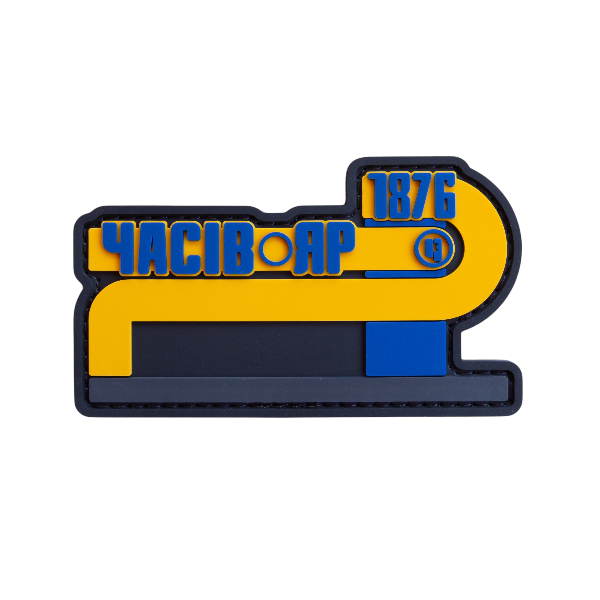 На зображенні представлений патч "Часів Яр". Цей оригінальний аксесуар виконаний у формі стрічки, де яскраво жовтим кольором виділено назву міста "ЧАСІВ ЯР" та цифри "1876", що, ймовірно, позначають рік заснування. Синій колір використовується для деяких елементів напису, створюючи контраст і підкреслюючи деталі. Патч стане чудовим доповненням для тих, хто бажає висловити свою приналежність або пам'ять про місто Часів Яр.
