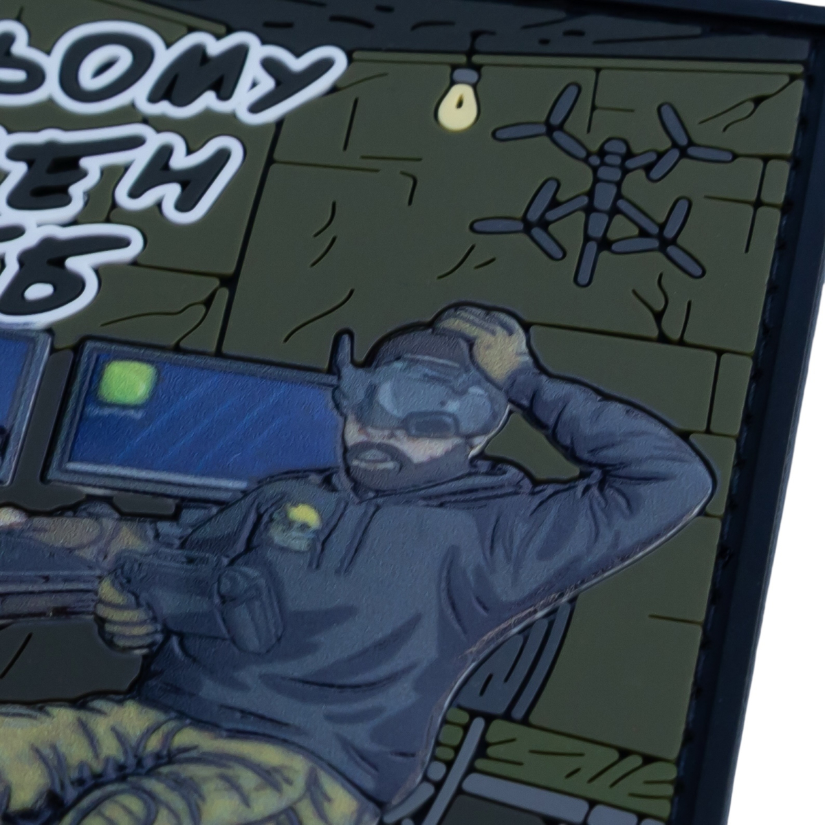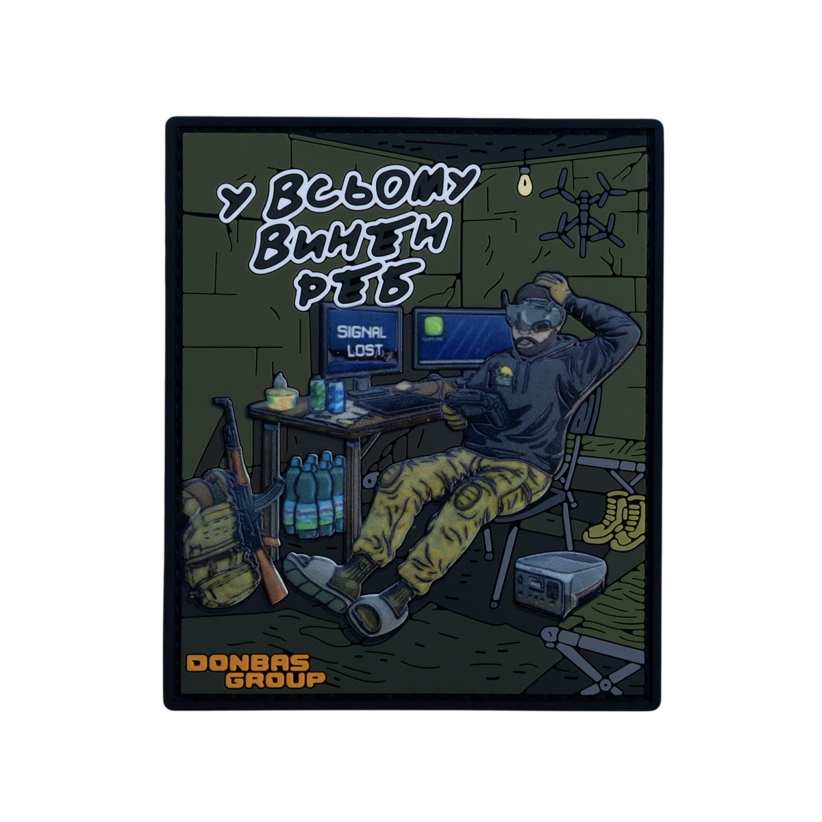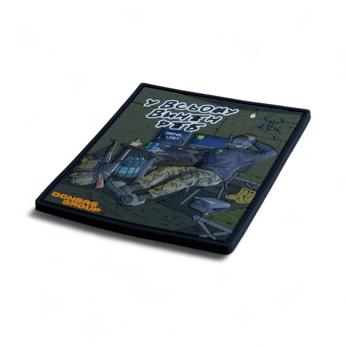 На патчі зображений боєць, який сидить у приміщенні і керує дроном за допомогою FPV-окулярів. На моніторі з'являється напис «SIGNAL LOST», що вказує на втрату сигналу з дроном. Це є гумористичним відсиланням до частих проблем з російськими засобами радіоелектронної боротьби (РЕБ), які створюють перешкоди для керування дронами на полі бою.