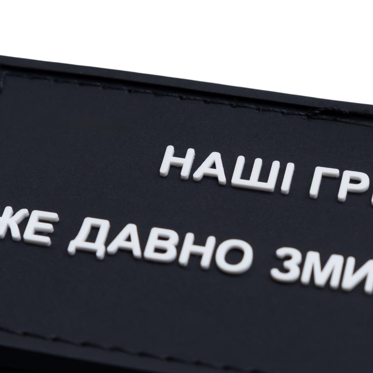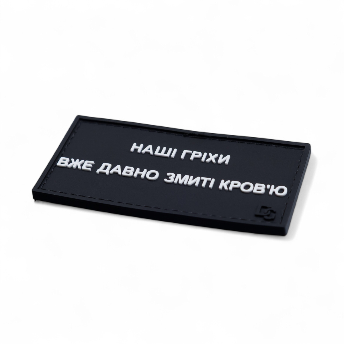 Цей патч - не просто аксесуар, а символ бунтарського духу та непокори. Чорний фон та контрастні білі цифри створюють вражаючий візуальний ефект, привертаючи увагу до провокаційного напису "Наші гріхи вже давно змиті кров'ю".
