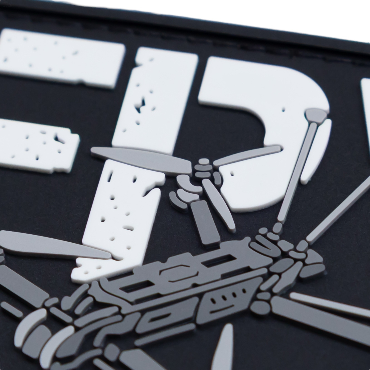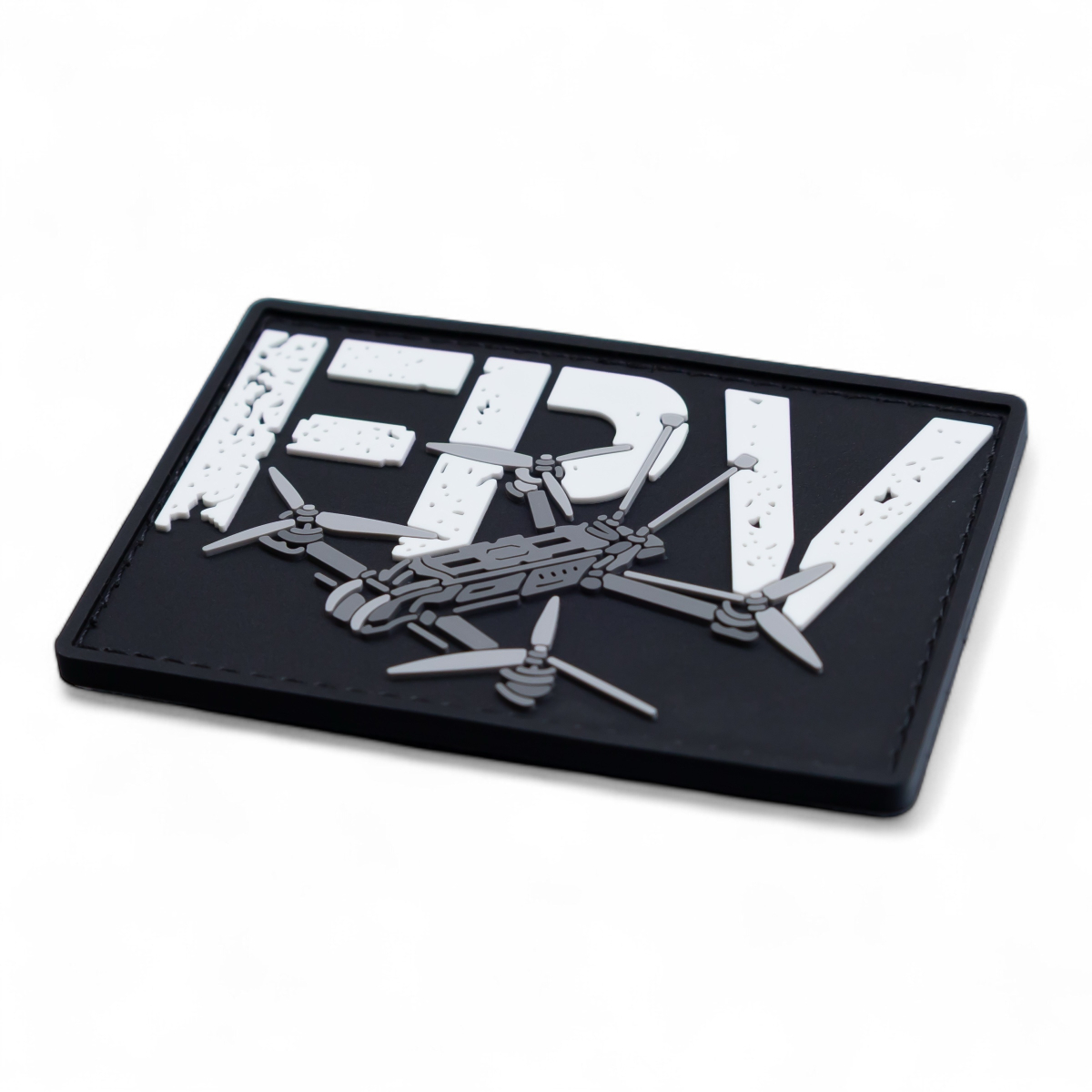 На тлі глибокого чорного поля, що символізує прихованість та глибину операцій, домінує велика, рішуча абревіатура "FPV". Літери виконані у білому кольорі із навмисним ефектом потертості та старіння, що надає їм "бойового" вигляду і підкреслює їхню історію застосування в реальних умовах.