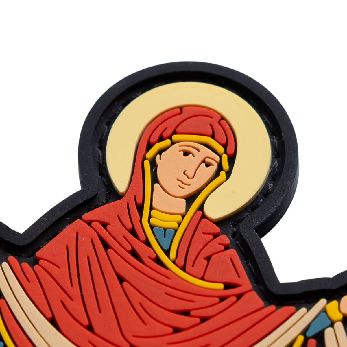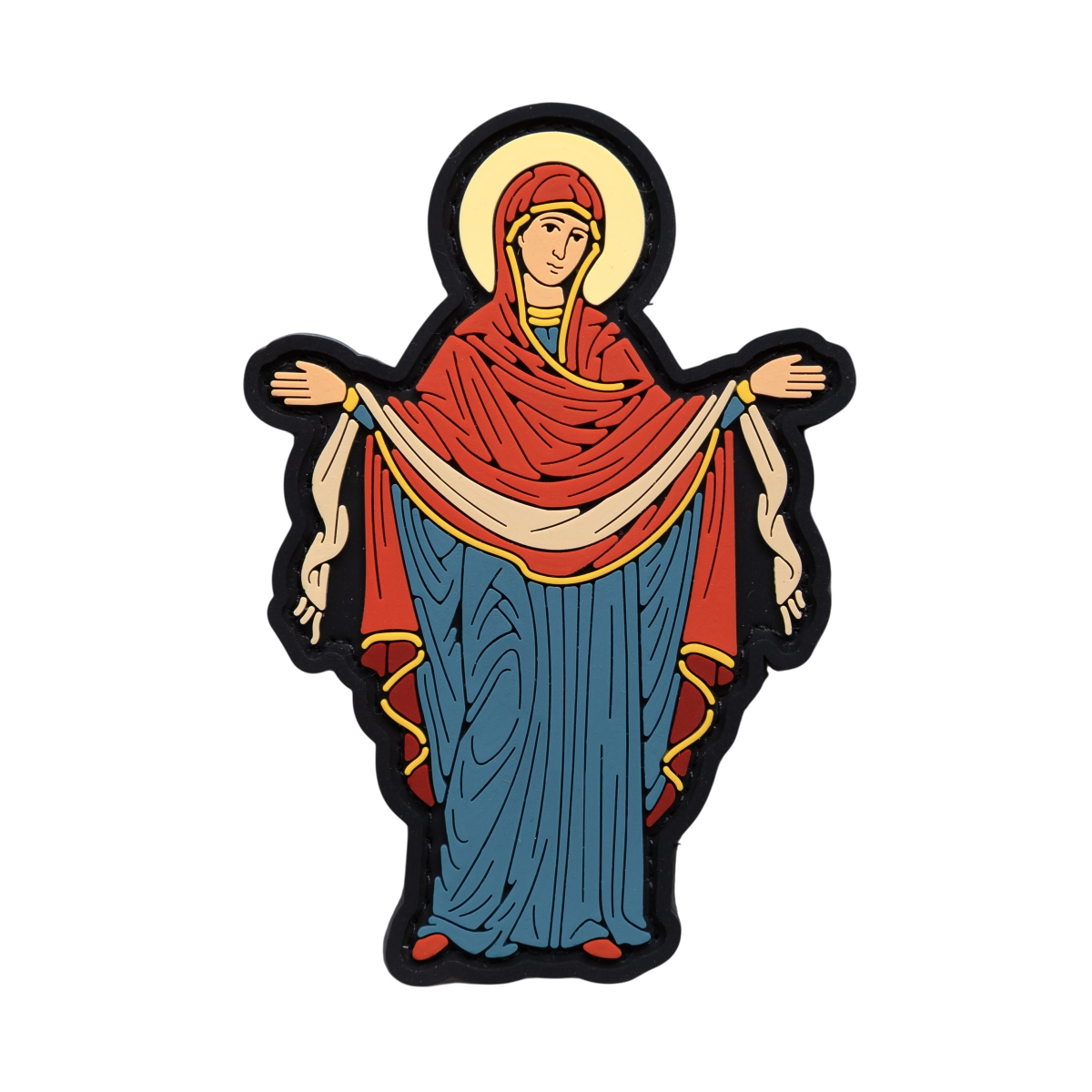 Виконаний у стилі класичної православної ікони, патч зображує Пресвяту Діву Марію у позі Оранти(Молільниці), з широко розведеними руками, що символізує заступництво та молитву за світ.
