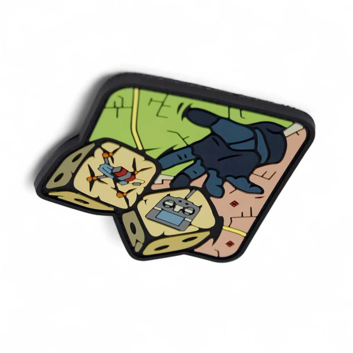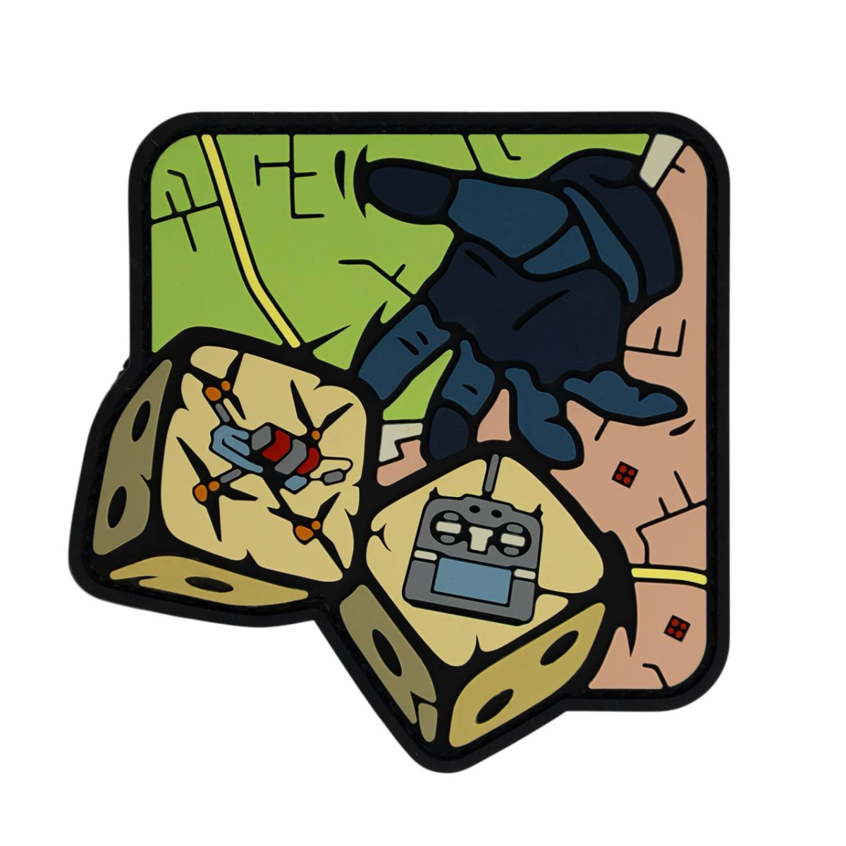 У центрі — рука в тактичній рукавиці, пофарбована у глибокий, майже нічний синій колір, що символізує професіоналізм і холодний розрахунок. Рука стрімко виринає на передній план, виконуючи доленосний кидок, що має змінити хід подій. Вона спирається на зелений фон, схожий на військове екіпірування або ретельно вивчену місцевість, з позначками на мапі.