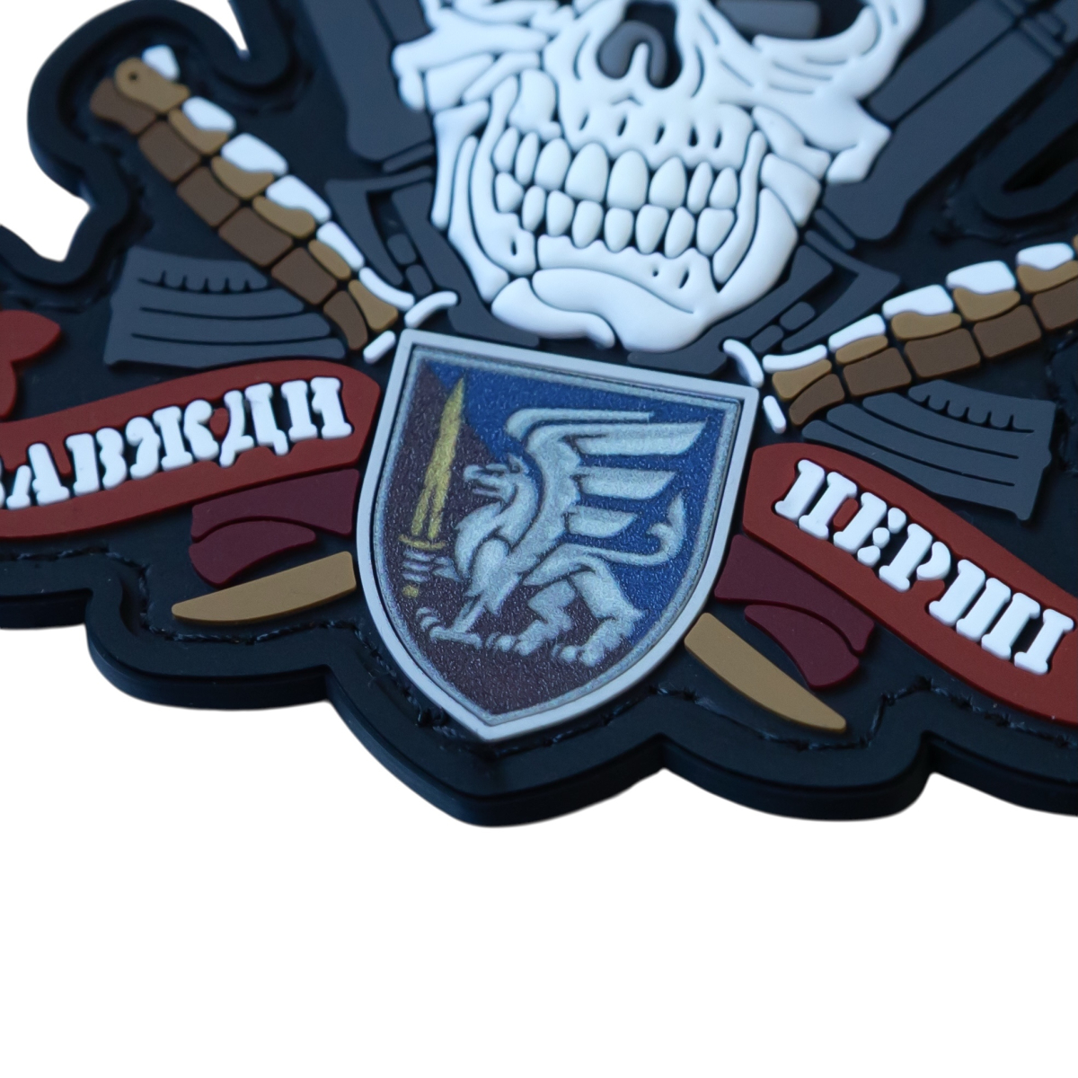 Центральний череп у криваво-червоному береті втілює презирство до небезпеки та є символом військової еліти, яка не знає страху. Схрещені автомати — це запорука вогневої міці, що супроводжує кожен крок передової групи. А в серці композиції, на щиті, пульсує дух підрозділу, що підтверджує його славетну історію.