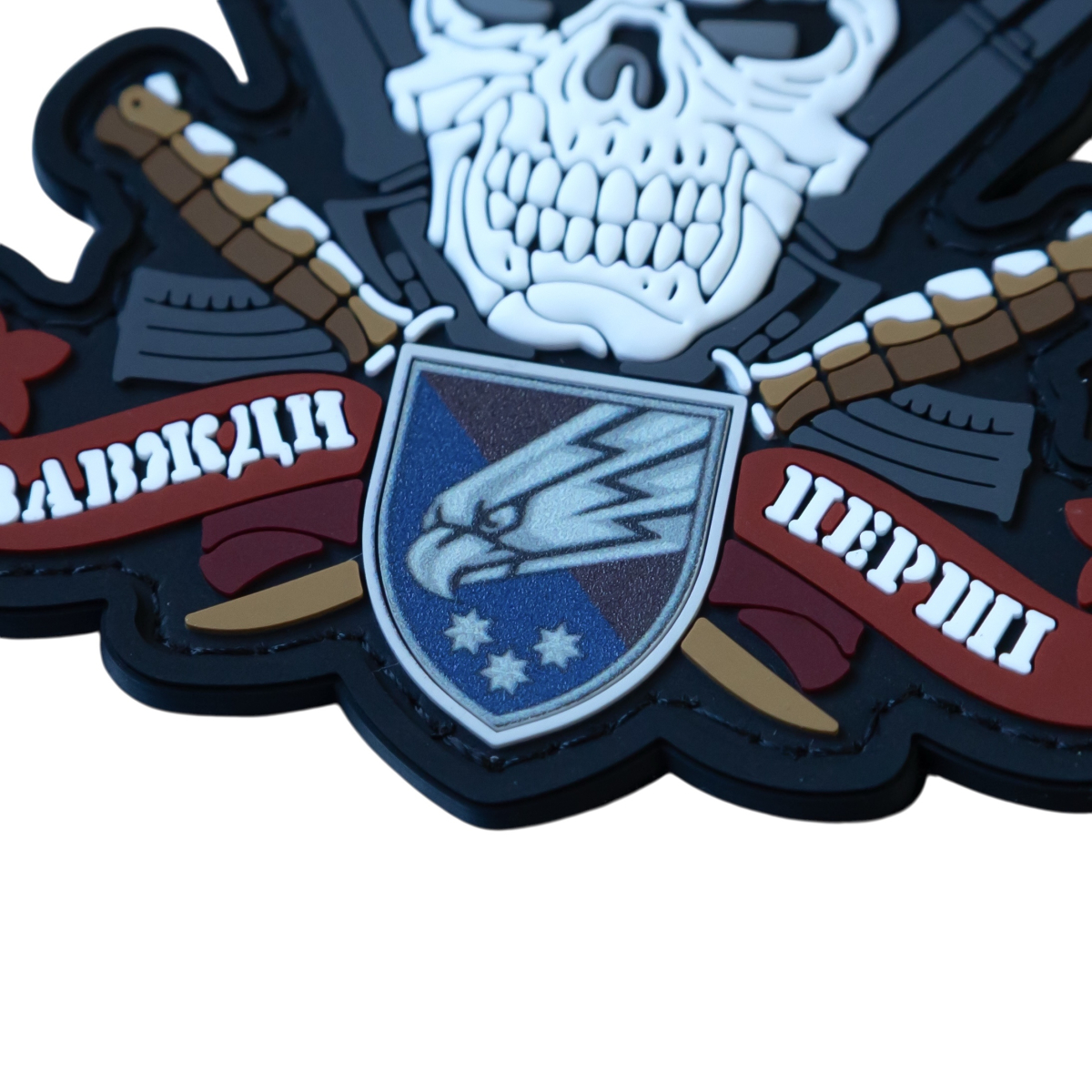 Центральний череп у криваво-червоному береті втілює презирство до небезпеки та є символом військової еліти, яка не знає страху. Схрещені автомати — це запорука вогневої міці, що супроводжує кожен крок передової групи. А в серці композиції, на щиті, пульсує дух підрозділу, що підтверджує його славетну історію.