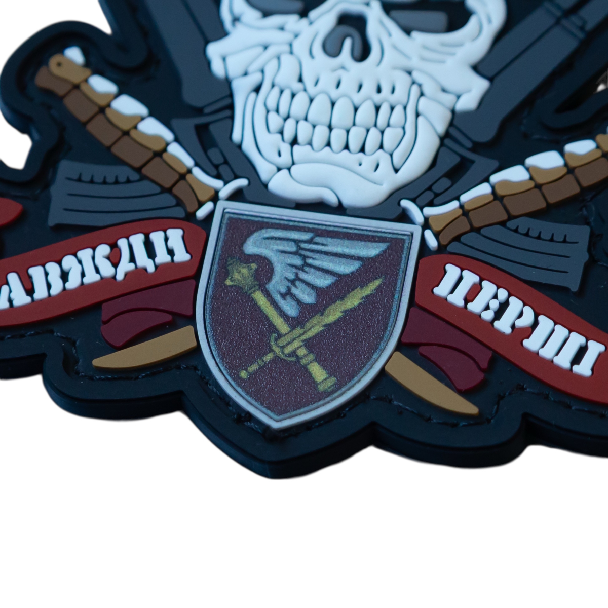 Центральний череп у криваво-червоному береті втілює презирство до небезпеки та є символом військової еліти, яка не знає страху. Схрещені автомати — це запорука вогневої міці, що супроводжує кожен крок передової групи. А в серці композиції, на щиті, пульсує дух підрозділу, що підтверджує його славетну історію.