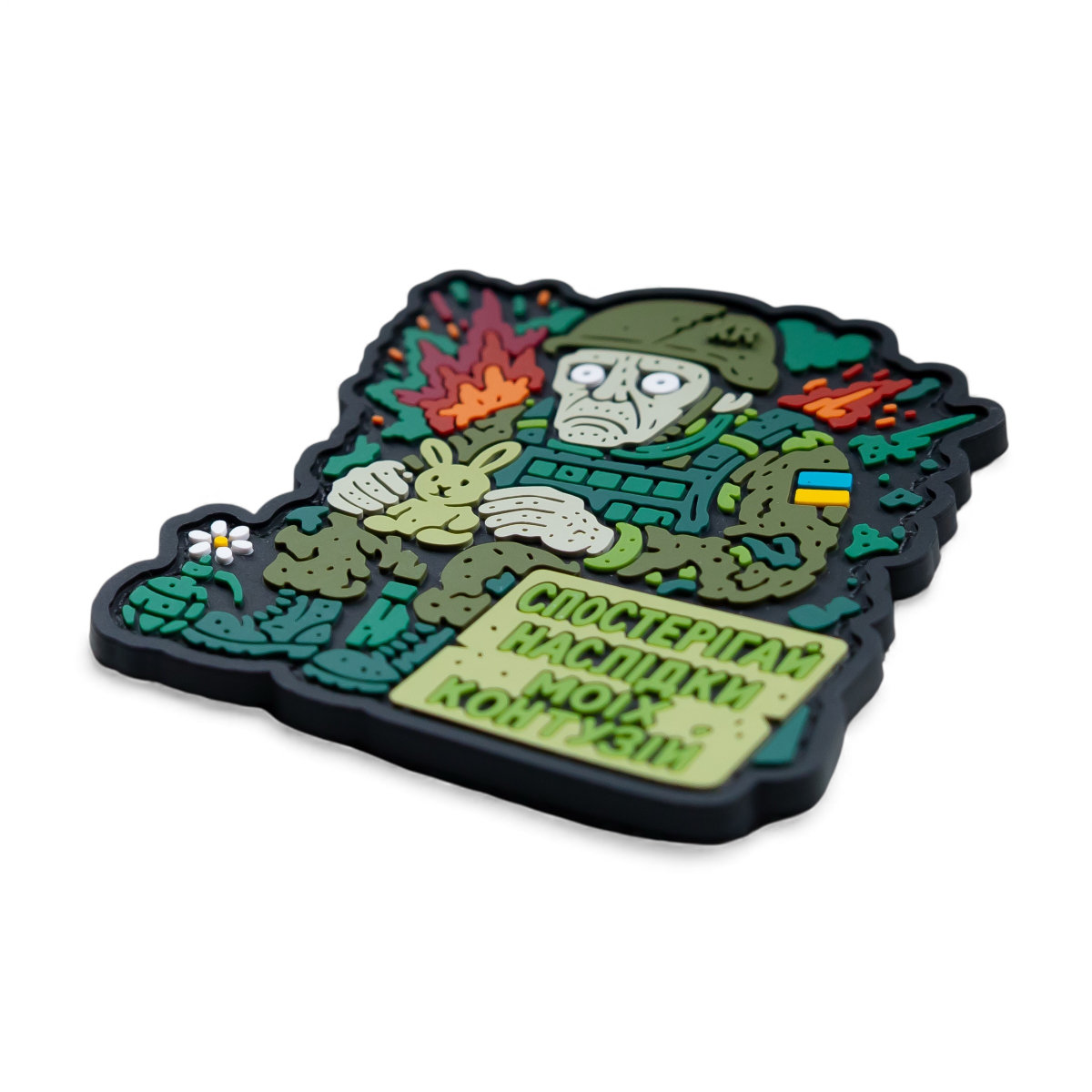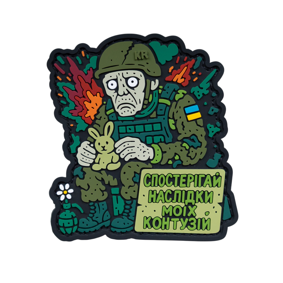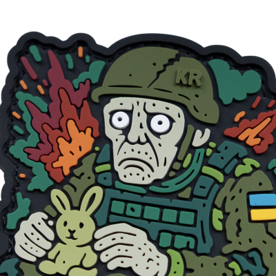 Порожній погляд, зайчик у руках, квітка біля ноги - іронія, яка зрозуміла тільки тим, хто пройшов крізь війну.