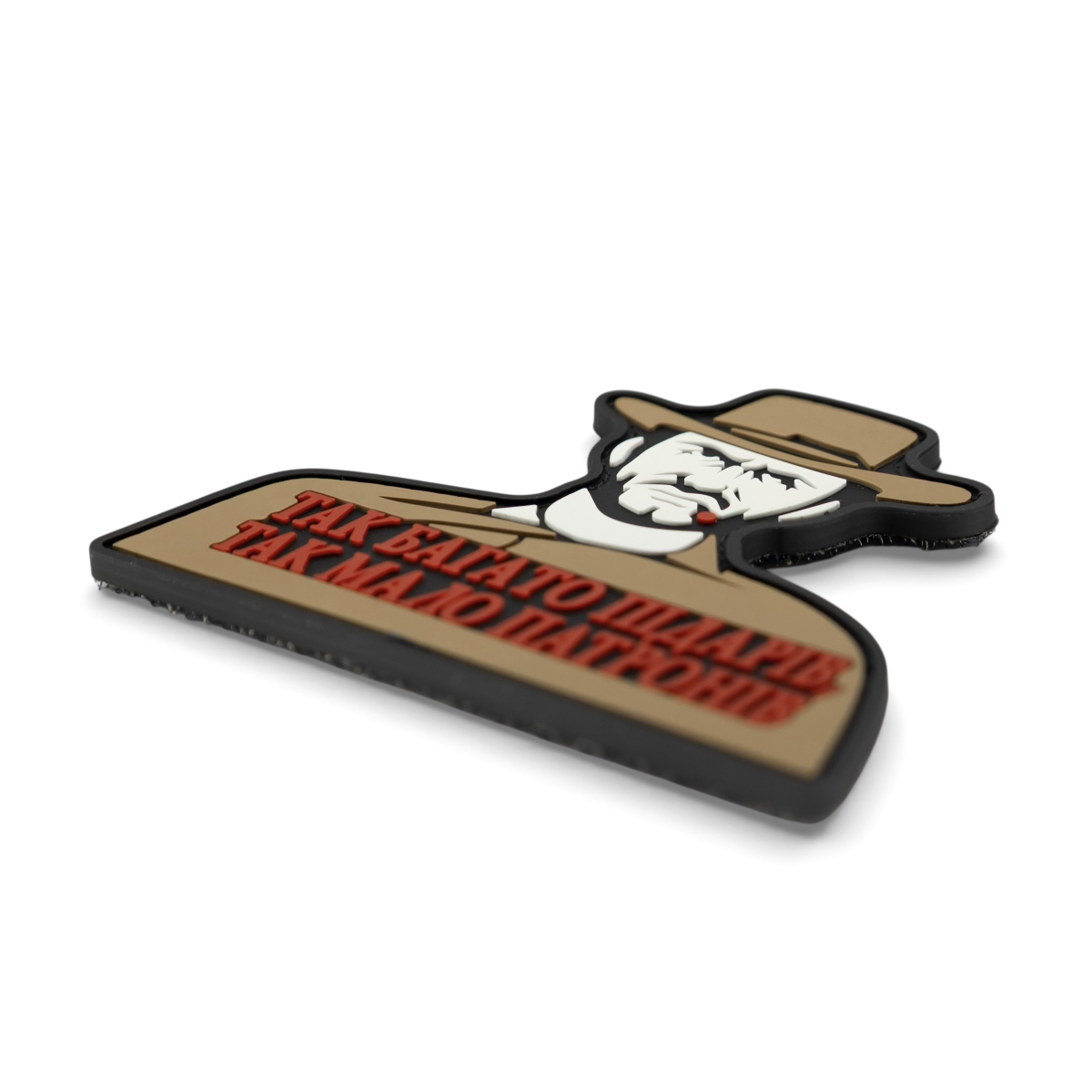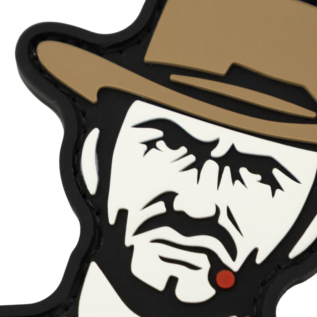Патч виконаний у характерних для вестерну кольорах: коричневому та бежевому, з чорними контурами, що надає йому виразності та об'ємності. Образ актора, виконаний у стилізованій графіці, доповнений традиційними елементами: широким ковбойським капелюхом та сигаретою, що стирчить з куточка рота, передаючи його незворушний та суворий вигляд.