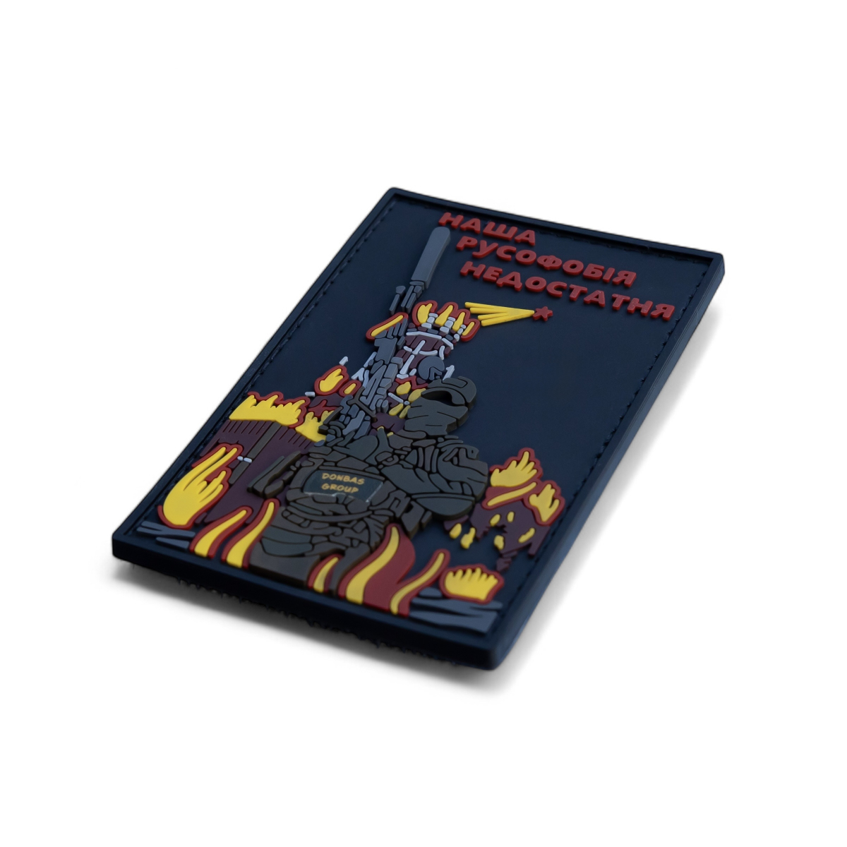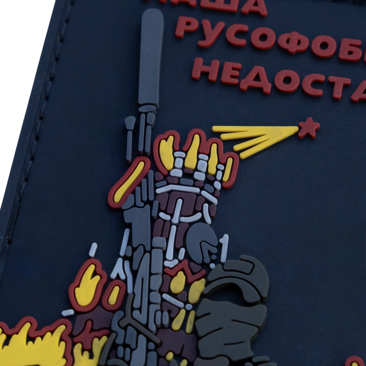 Огонь, охвативший здания, символизирует разрушения, которые приносит война. Воин с ПЗРК, нацеленный на красную звезду — давний символ советской, а теперь и российской армии — олицетворяет не только физическое противостояние, но и идеологическую борьбу. Фраза «Наша русофобия недостаточна» является острым выражением, подчеркивающим глубокое неприятие идеологии и агрессии врага, а также указывающим на готовность к решительным действиям, необходимым для победы.