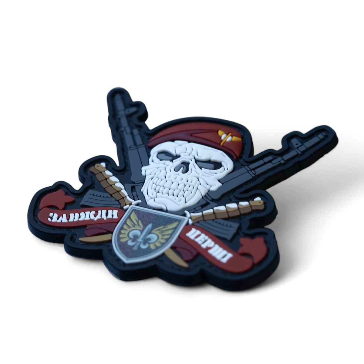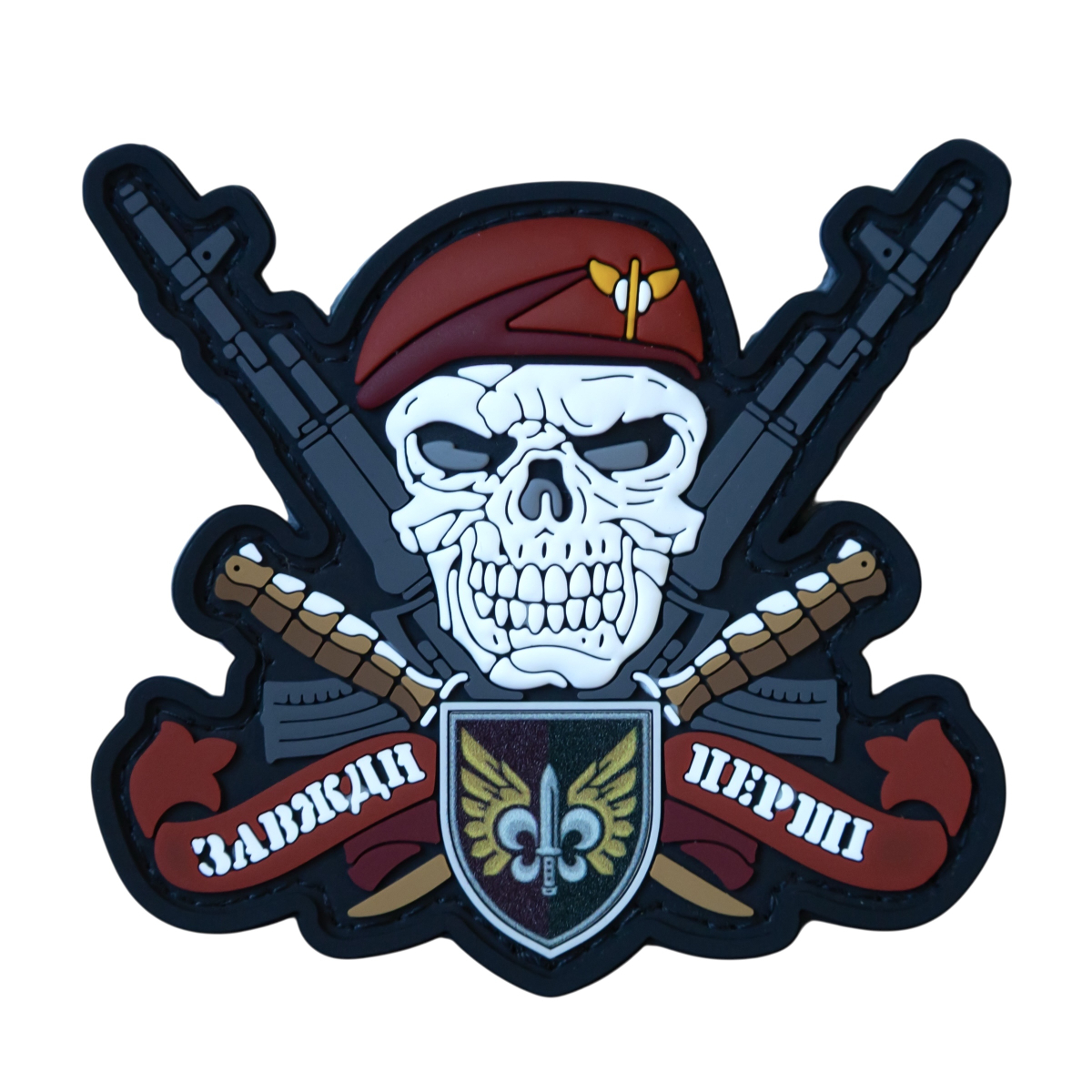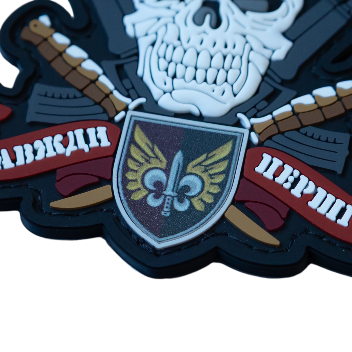 Центральный череп в кроваво-красном берете олицетворяет презрение к опасности и является символом военной элиты, не знающей страха. Скрещенные автоматы — это залог огневой мощи, сопровождающей каждый шаг передовой группы. А в сердце композиции, на щите, пульсирует дух подразделения, подтверждающий его славную историю.