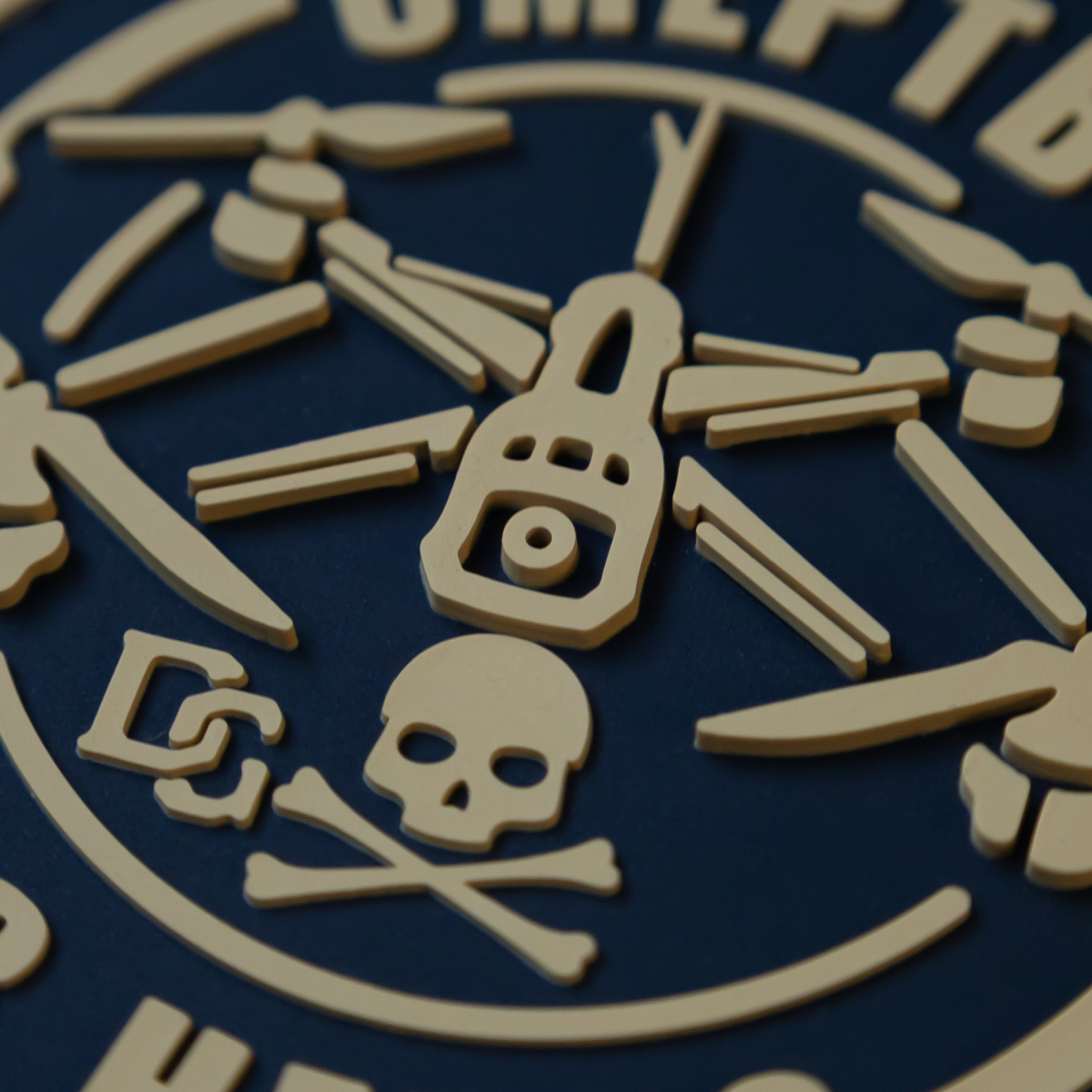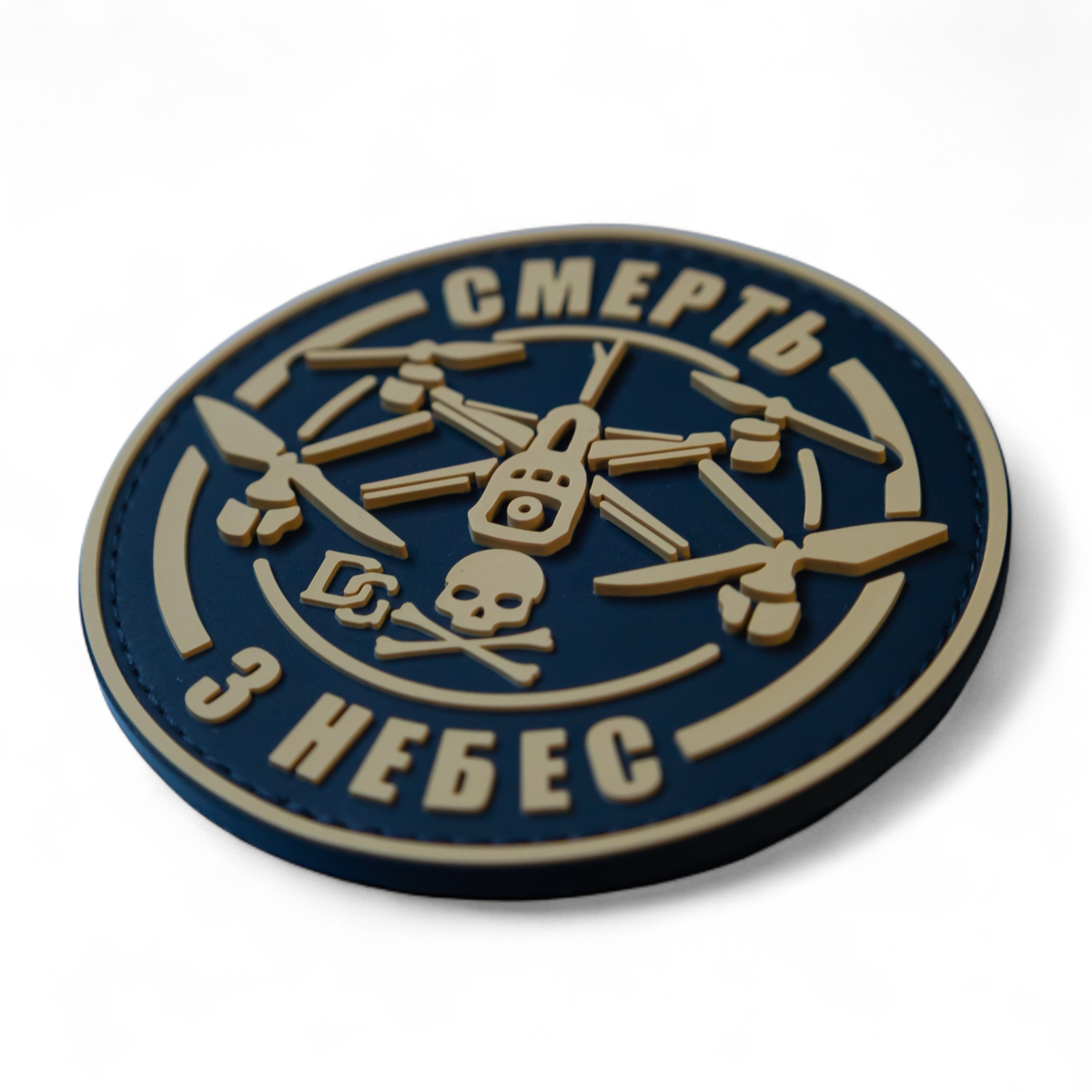 Этот круглый патч с мощным лозунгом «СМЕРТЬ С НЕБЕС» является прямым и грозным символом современного военного превосходства. В центре композиции изображен боевой дрон-квадрокоптер, а под ним — классический пиратский символ черепа и скрещенных костей, символизирующий неизбежную опасность и фатальный исход. Патч четко передает идею высокоточной, безжалостной и неожиданной ликвидации, осуществляемой с воздуха, подчеркивая роль беспилотных аппаратов на поле боя.