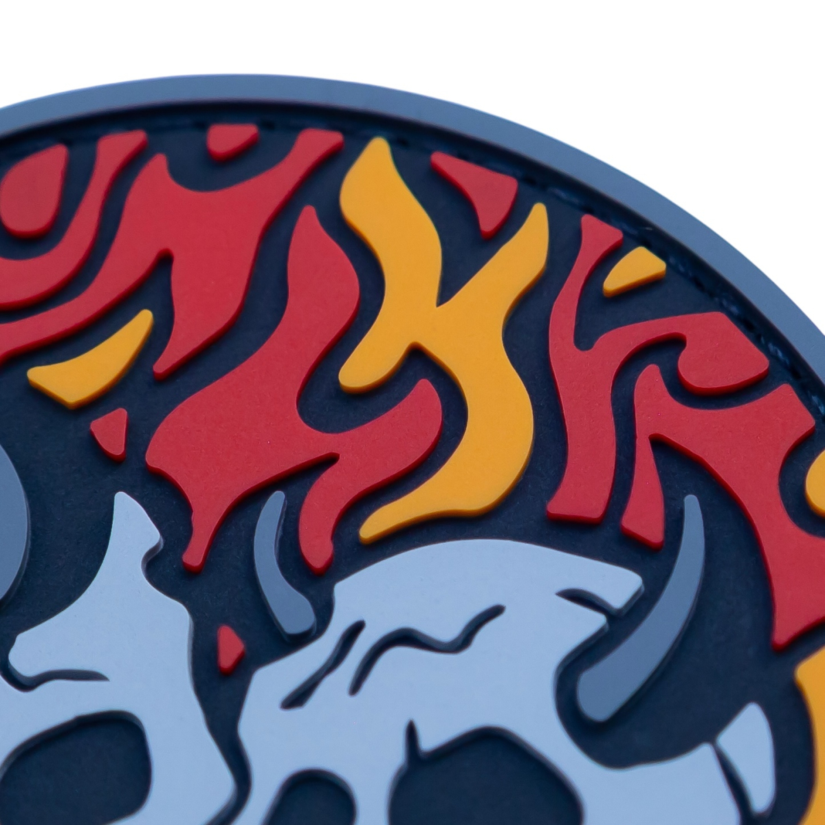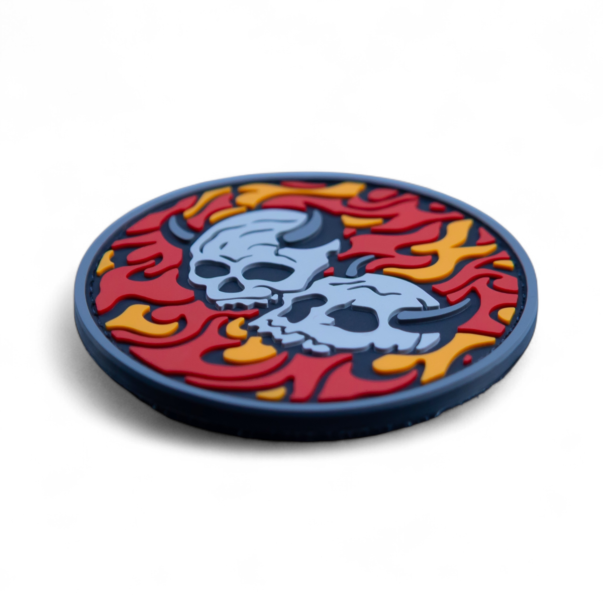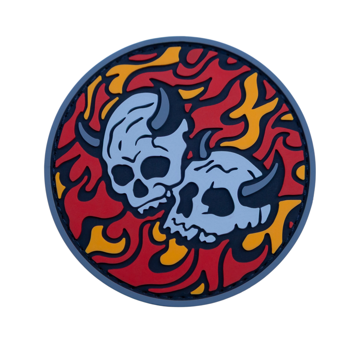 Этот патч представляет собой круглую нашивку с изображением двух стилизованных черепов с рогами, окруженных пламенем или витиеватыми узорами. Изображение выполнено в контрастных тонах, что придает ему выразительность и четкость. Общий дизайн выглядит брутально и может ассоциироваться с различными субкультурами, рок-музыкой или символизировать силу, стойкость и преодоление.